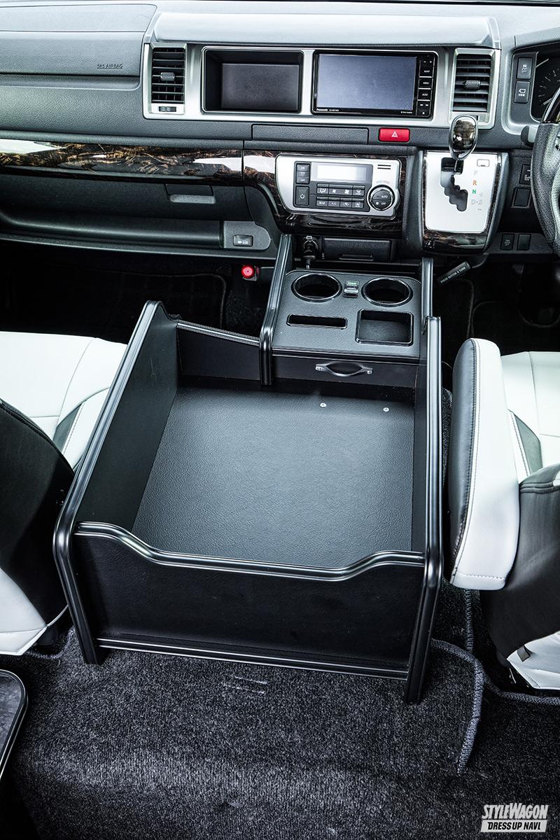 そこでおすすめなのが、ハイエース向けに内外装多くのアイテムをプロデュースしているLEGANCE(レガンス)のインテリアドッグコンソールボックス。ワンちゃんがくつろげる十分なスペースがあるのはもちろん、本体やモールの色などを選べるので自分好みの仕様に作り上げることができるのも特徴。取り付けも純正コンソールをはずしてネジで固定するだけと簡単だ。