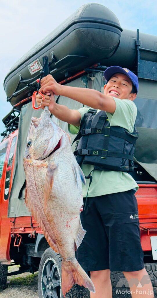 こちらは今年つった最大の鯛。そのサイズはなんと90センチオーバー。息子さんやバグトラックと比べてもらえばそのサイズ感がわかるはず。