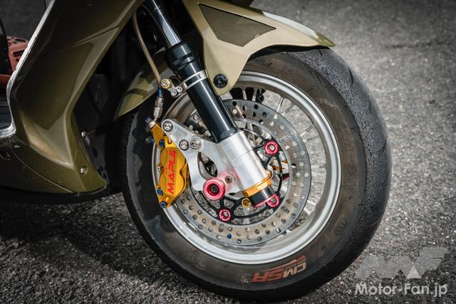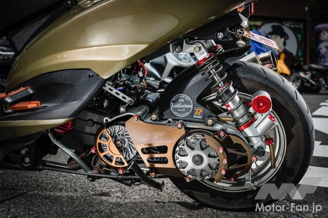 180ccエンジンに合わせるマフラーも、エンジンパーツ同様にセッキー2製を採用。ホイールはフロント同様シャークファクトリー製のアルミ鍛造で、スイングアームもシャークファクトリー製。