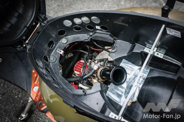 180cc仕様のエンジンには、ダウンドラフトタイプのスロットルボディから混合気が送られる。シート下は仕切り板の後方だけ荷物を積載できる仕様となっている。