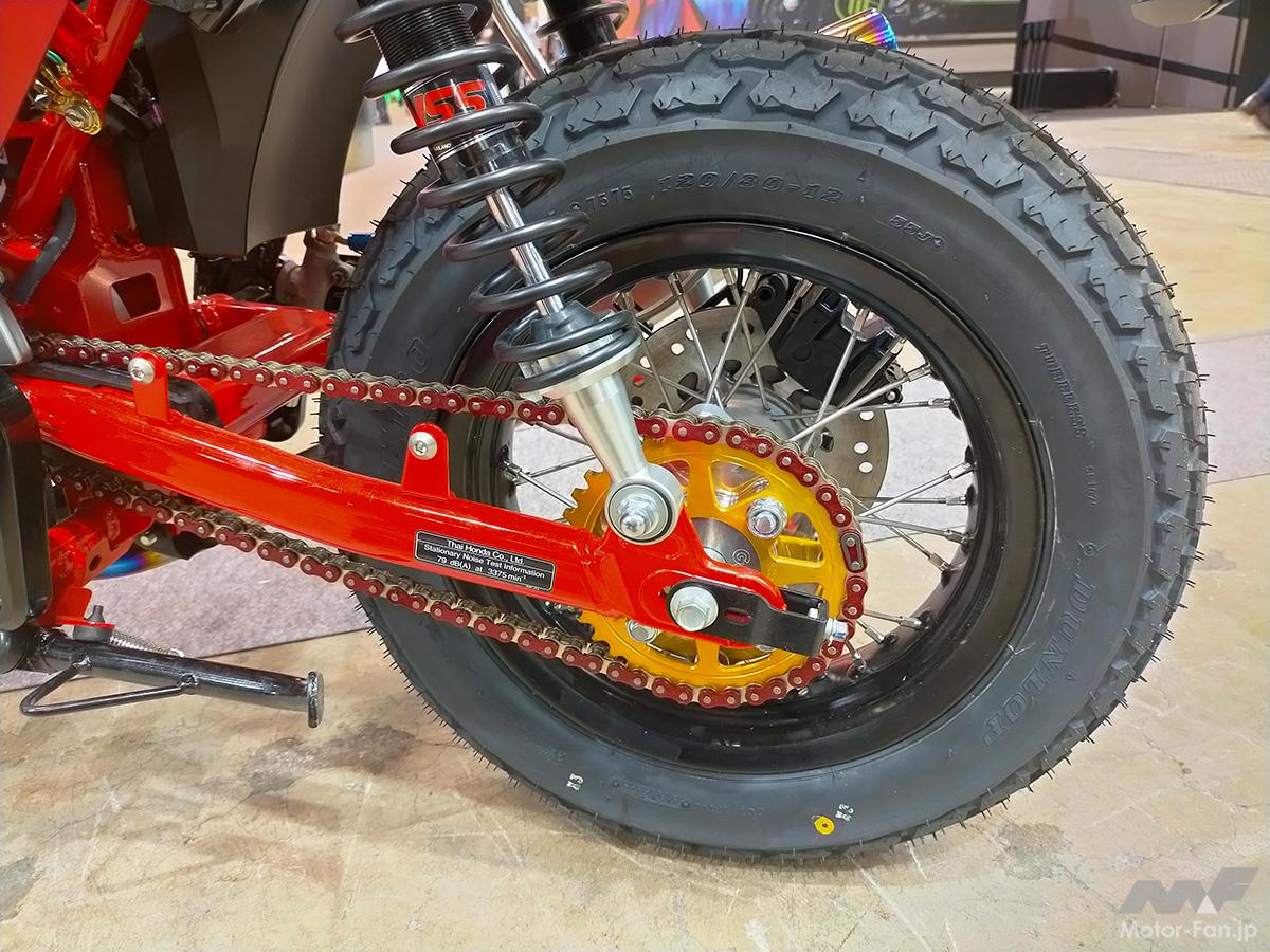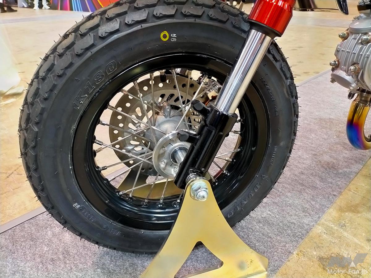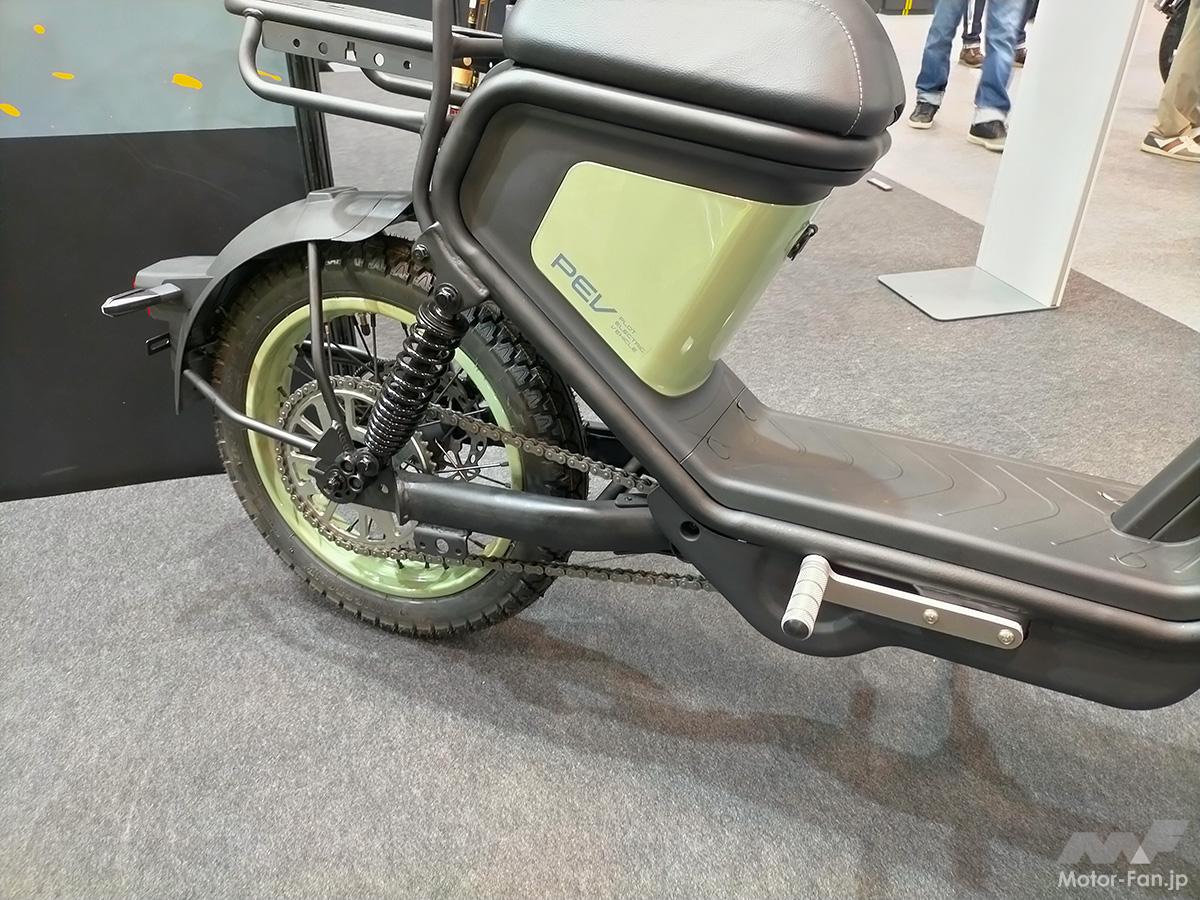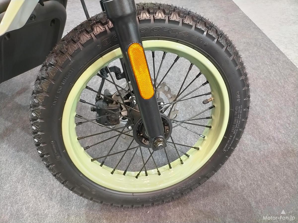 同車は正立型フロントフォークとツイン式リアショック。前後のブレーキはディスク式。前後に14インチのスポークホイールとブロックパターンタイヤを採用。電動モーターからリアホイールへの駆動はドライブチェーンを導入。