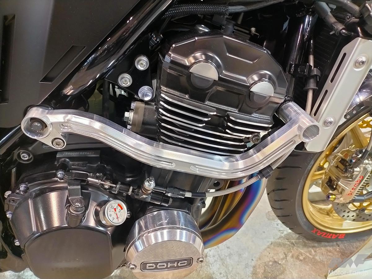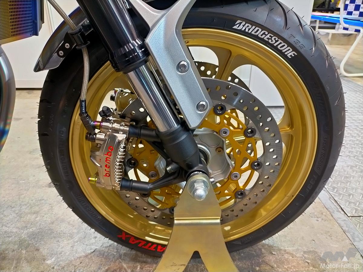 2024年に満を持して販売開始となった、ブレンボ製アップグレードキャリパー「GP4MS」も導入。同アイテムは削り出し、モノブロック構造、冷却フィン、ニッケルコーティングなど、すべてが最高レベルの逸品。ブレンボ製キャリパーの装着にあたり、周辺部品はブレンボ代理店を担う、プロトのオリジナルパーツを駆使。
