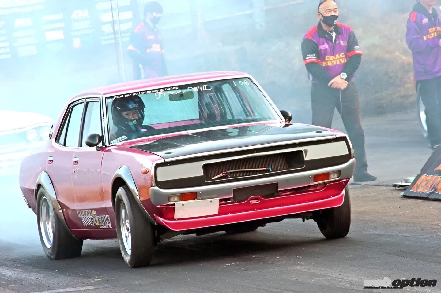 ドラッグレースシーンにおいて、L型エンジン搭載車はボディが軽くてトラクションも稼ぎやすいS30系フェアレディZが主役だ。そんなセオリーを無視して、4代目スカイラインの4ドアモデル(通称ヨンメリ)で戦い続けているのが淀名和さんだ。
