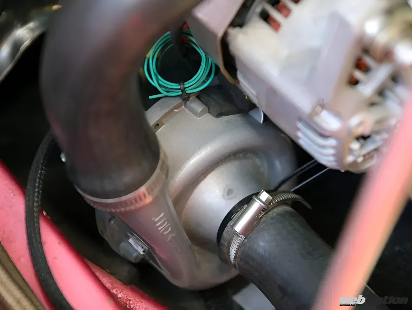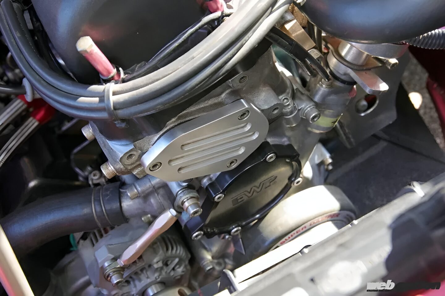 エンジンのフリクションを減らすために、ウォーターポンプをEWPの製品で電動化しているのも大きな特徴。エンジン出力を全て駆動系に回すよう製作されているのだ。