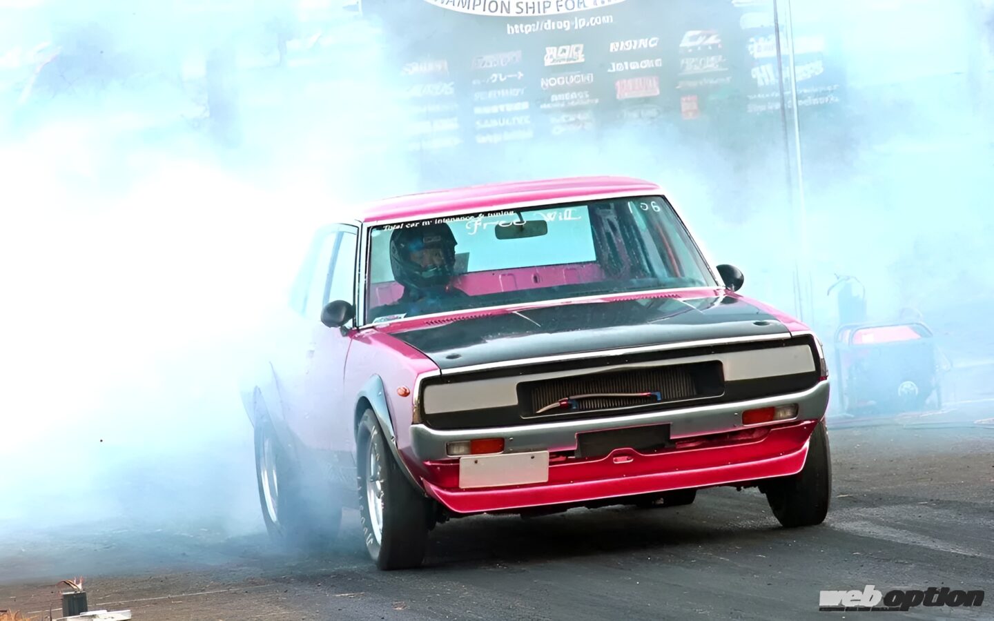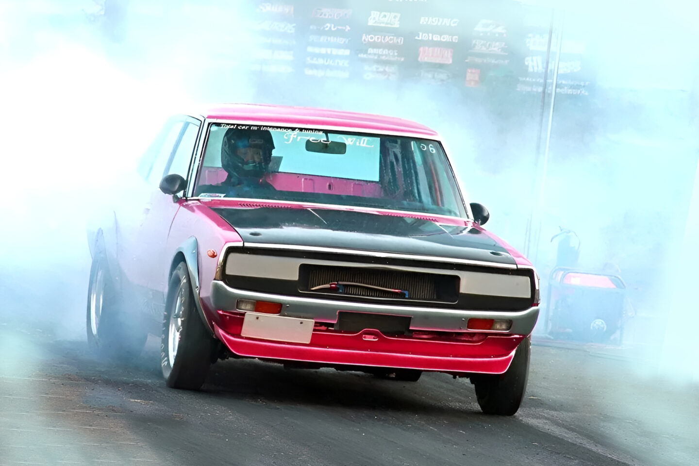 ドラッグレースシーンにおいて、L型エンジン搭載車はボディが軽くてトラクションも稼ぎやすいS30系フェアレディZが主役だ。そんなセオリーを無視して、4代目スカイラインの4ドアモデル(通称ヨンメリ)で戦い続けているのが淀名和さんだ。