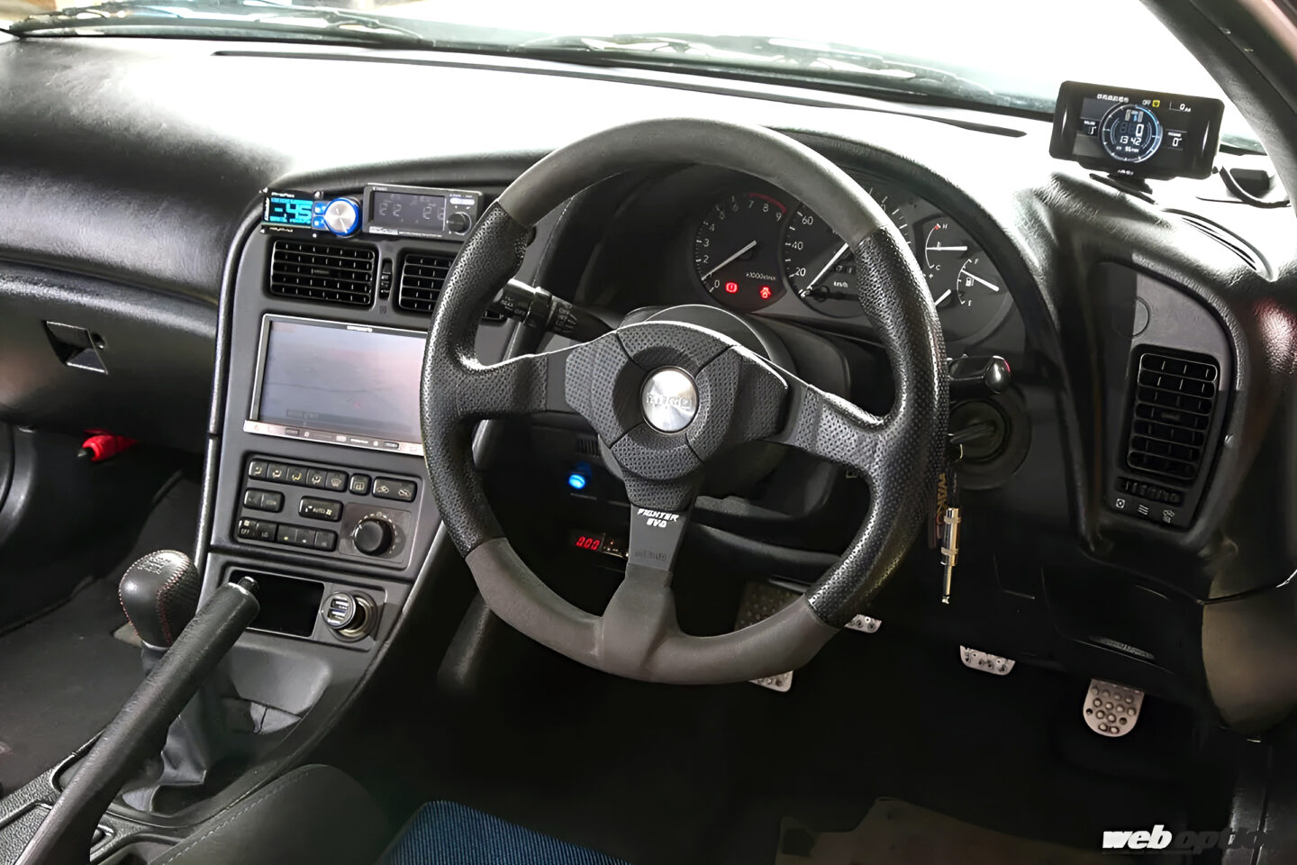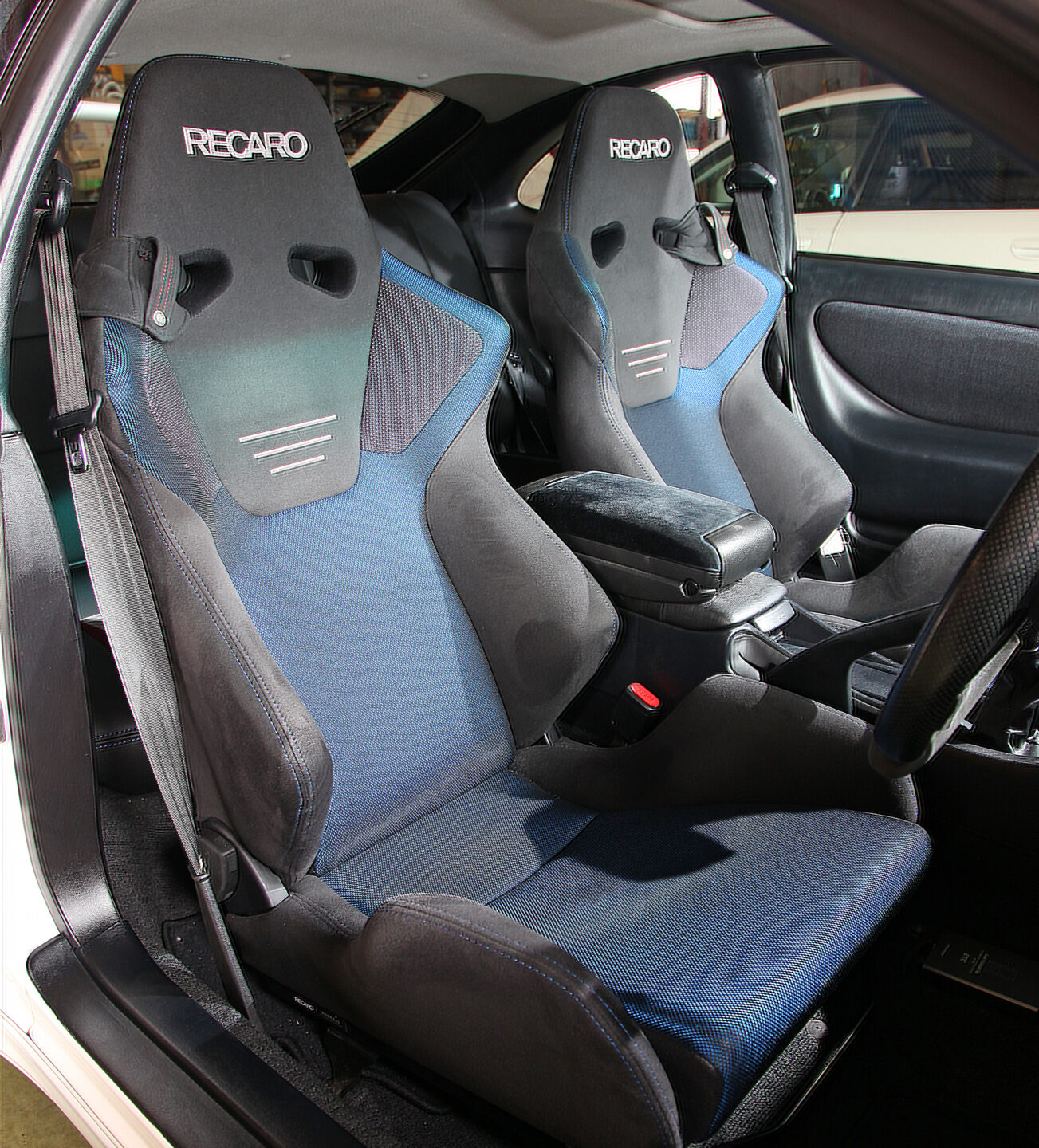 フロントシートはファブリック表皮のスポーツシートが標準で、オプションとして本革タイプも用意。高橋さんのマシンは純正が劣化してしまったので、補修を兼ねてレカロのリクライニングタイプに変更している。