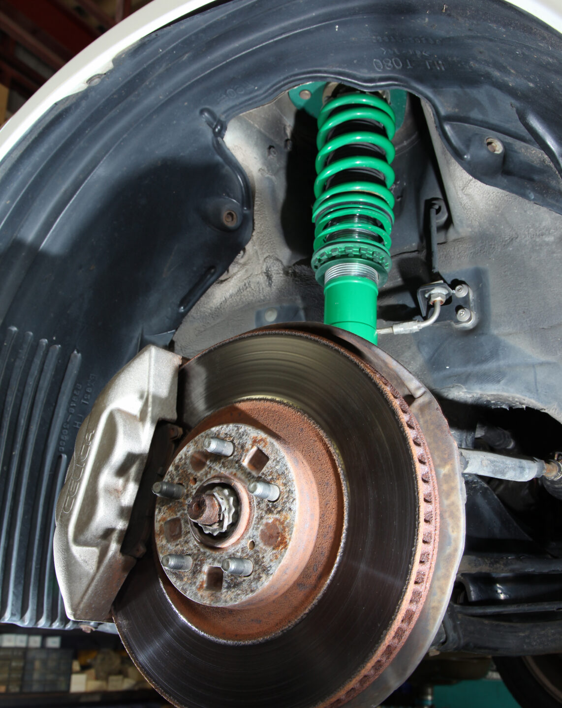 フロントはスーパーストラットもST205での大きな進化点で、高橋さんのマシンはワンオフ製作のテイン車高調+EDFCに変更。前後オールアルミ製キャリパーを採用する16インチブレーキは効きに不満はないようだ。