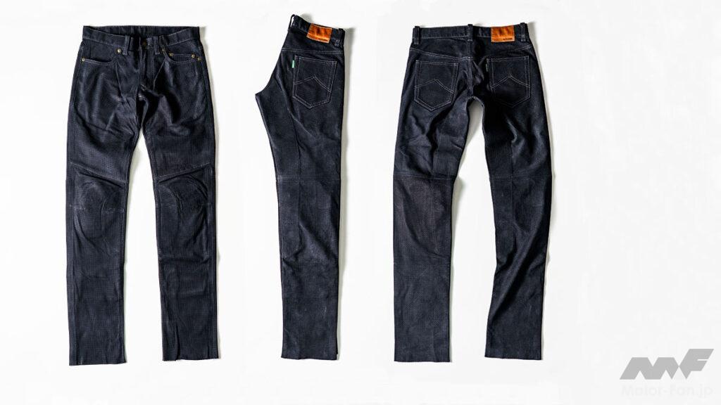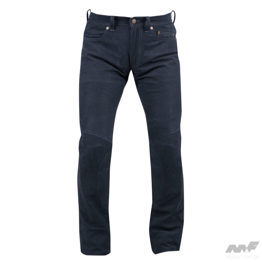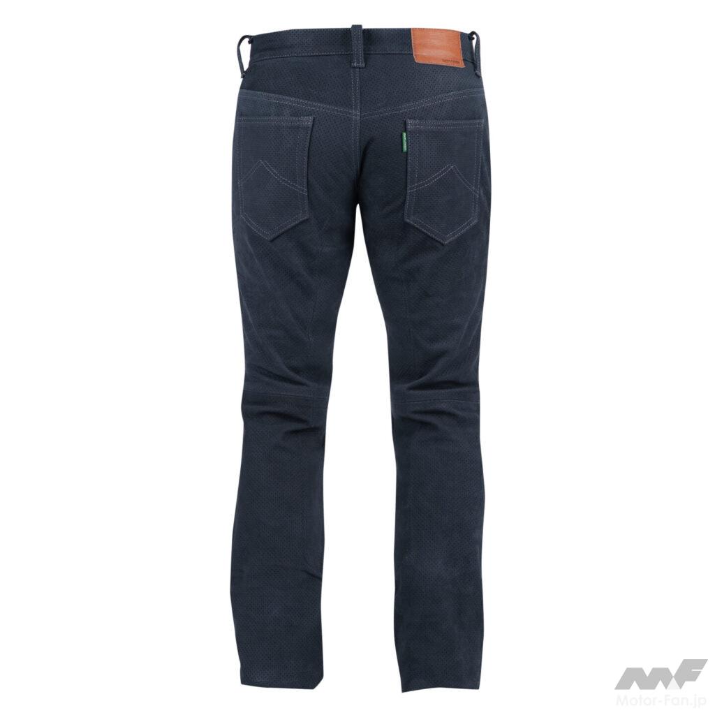 天然皮革の持つ防風性、耐風性、透湿性を保ちながら、独自の加工技術により優れた撥水性を持ち合わせたエクスプローラージーンズは、ツーリングを快適に過ごせるように生み出されている。この技術が活かされたプロトコアレザーがサーキットで使用する革ツナギにも採用されている。今回追加されたのはスマートなローライズシルエットが特徴であるエクスプローラーライドジーンズのメッシュモデル。お尻から膝にかけて、車両からの排熱を和らげるために、本体裏側に当て布を装備。この当て布には輻射熱を反射するアルミ蒸着素材を配して熱さから足を守ってくれる。裏地にはCOOLMAX素材が採用されているため、汗をかいても素早く吸収して乾燥するのはもちろん、蒸発の際の気化熱によって涼しく保ってくれる。エクスプローラーライドジーンズは、定番モデルのEX-1120エクスプローラージーンズより股上を4cm浅くすることで、ライディング時の前傾姿勢を取ったときの腹部への食い込みを軽減している。