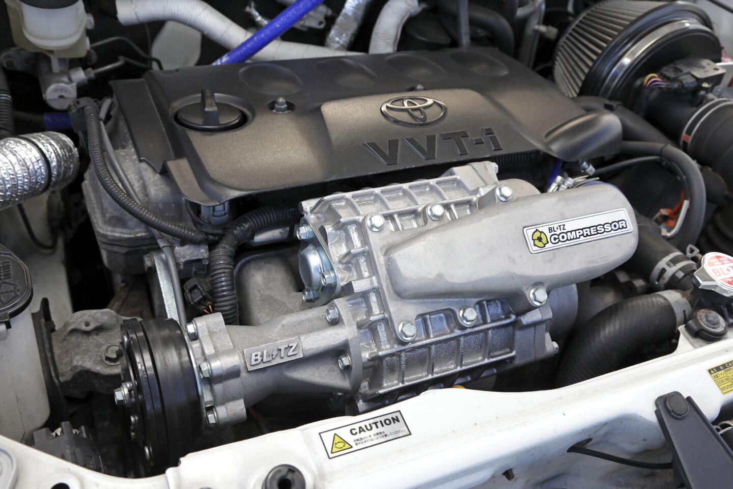 1NZエンジンに装着されるスーパーチャージャーは、電磁クラッチ機構を持つオグラクラッチ製のルーツ式。ブリッツではそれを軸に、必要なパーツをセットにした各車種向けの『コンプレッサーシステム』を手がけ、実は50プロボックスのAT車用キットも用意されていたりする。ただし、適合が2010年6月までの生産車となっていて、それより年式が新しいブリッツ号ではプーリー位置などが異なるため、各部を手直ししたものだ。