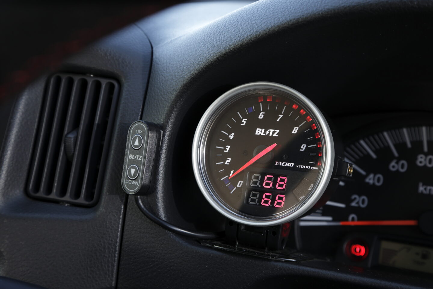 タコメーターはOBDIIポートから情報を取得するブリッツ『FLDメータータコ』を採用。外周の赤いLEDでワーニングゾーンの設定ができる他、下のデジタル部に水温や油温、車速、スロットル開度などを表示することも可能。ちなみに、ブリッツ号では水温を常時表示させている。