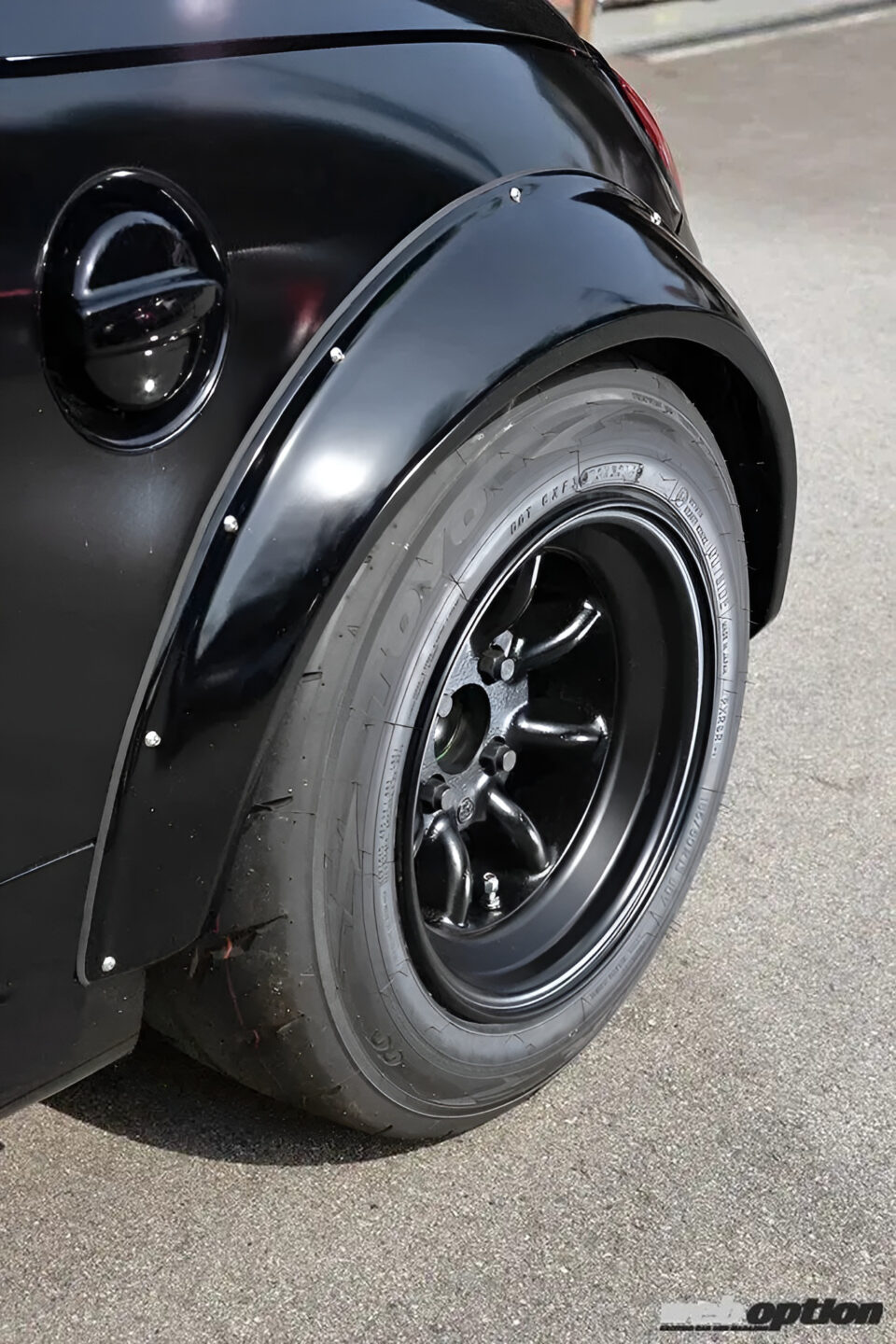 迫力のビス留めフェンダーは100mmワイドを実現するテイクオフ製で、足元には深リムのRSワタナベ8スポークRS(8J-6×13)をセレクト。そこに185/60-13という高扁平のプロクセスR888Rを組み合わせることで、コペンとは思えない重厚感溢れる雰囲気を手にしている。