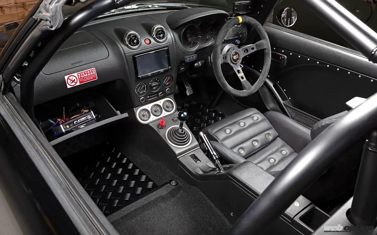 シートはレカロのTS-Gをベースとしながら、ブラックレザーへの張替えやハトメパンチ加工によってクラシカルなイメージを演出。ロールケージはD-SPORT製6点式がベースで、バーリング溶接加工なども施されている。