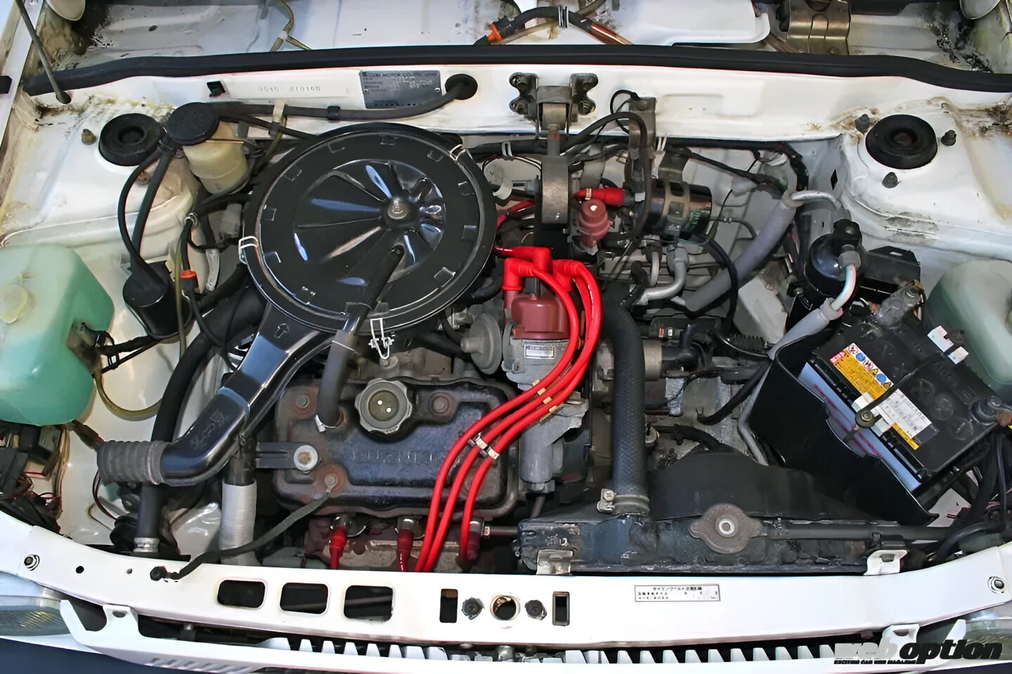 ボンネットの下に収まるのは、550ccのF5A型。1978年、フロンテに初めて搭載されたエンジンだ。同じエンジン型式で、2バルブSOHCインタークーラーなしターボ(キャブ)/同インタークーラー付きターボ(EPI)、3バルブSOHCスーパーチャージャー、4バルブDOHC/同インタークーラー付きターボと多くの仕様が存在した。