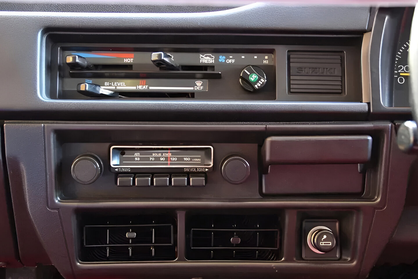 上段からマニュアルエアコン、AMラジオ&灰皿、エアコン吹き出し口&シガーライターが並ぶセンターコンソール。一応、最低限の快適装備は備わっている。