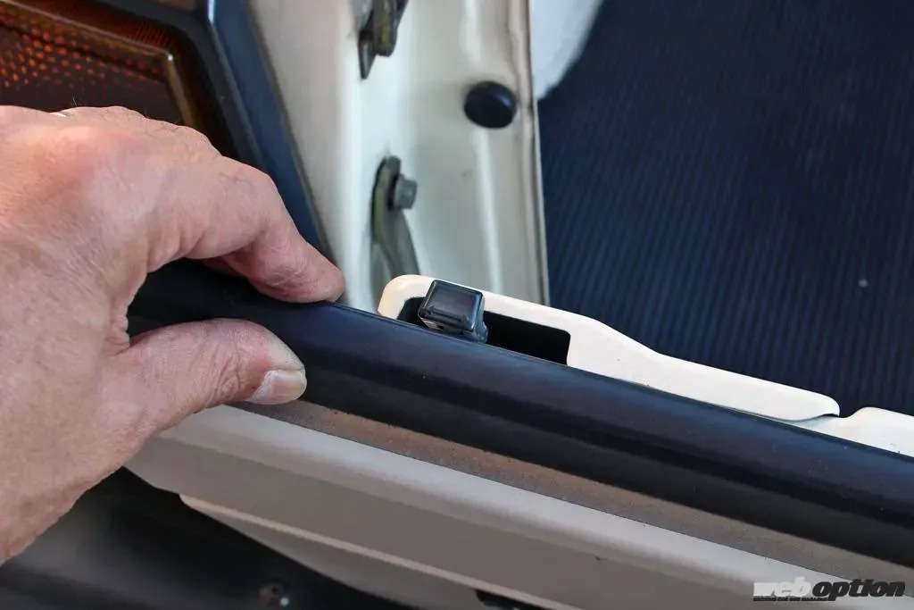 せっかくの機会なので、さらにハードトップの細部を見ていく。リヤガラスゲート中央下にある開閉用ノブ。いかにも昭和的な形状で、「クルマにこんな形状のパーツを使うのか」と思わずにはいられない。写真は閉まっている状態で、ノブを90度回すとゲートが開く。