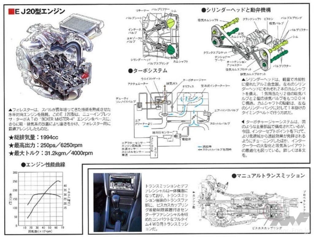 パワートレインは、最高出力137ps/最大トルク19.0kgmを発揮する2.0L水平対向4気筒DOHC、220ps/31.5kgmのインタークーラーターボの2種エンジンと、5速MTおよび4速ATの組み合わせ、当然シンメトリカルAWDである。
