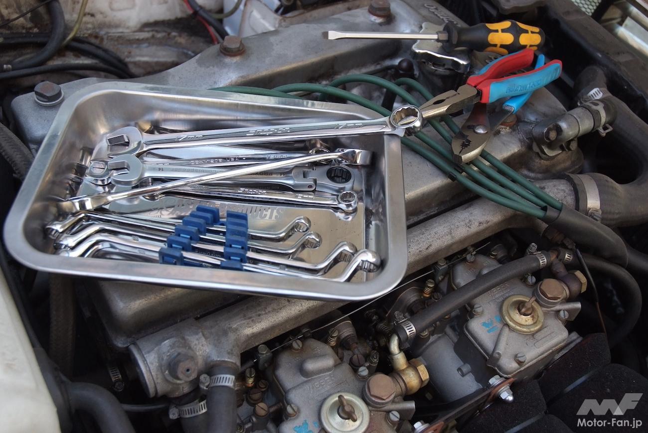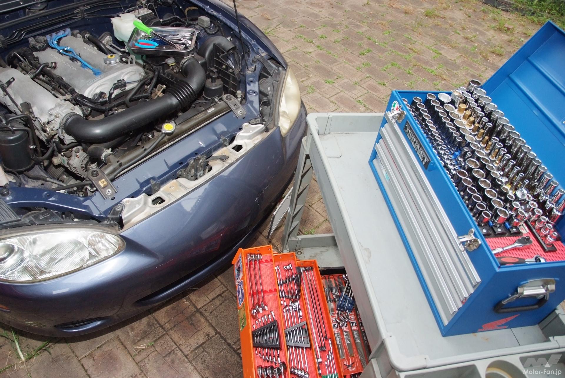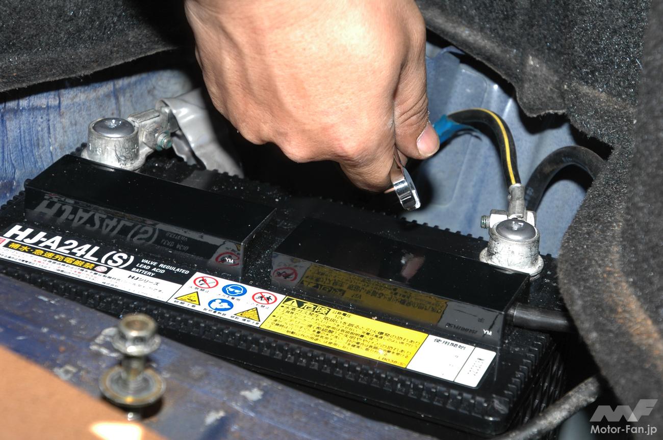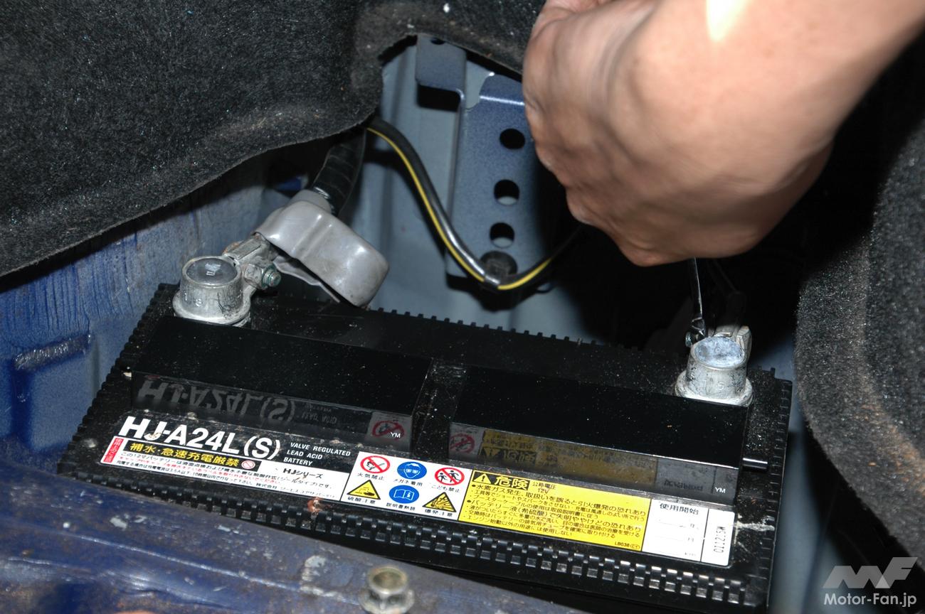今回作業するNB型ロードスターや旧車のアルファロメオのような設計の古いクルマならとくに注意すべきところもない。だが、電子制御機器が増えた最近のクルマの場合、カーナビやオーディオ、ECUなどの電子メモリーを保存するため、作業時に「メモリーバックアップ」などの補助電源を使用する必要がある(今回は使用していない)。