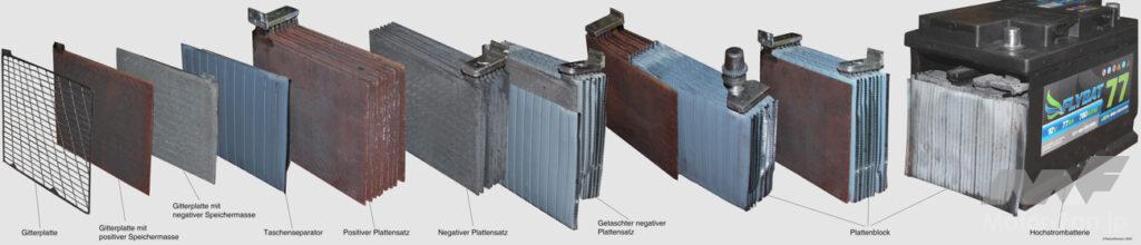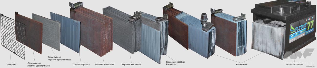 乗用車に広く普及している12Vの鉛バッテリーは、鉛蓄電池の1セル(層)あたりの公称電圧が約2Vとなることから6セルを直列に並べて12Vとしている。1つのセルの内部には、プラスとマイナスの極板が交互に重なっており、極版は両極とも同じ構造をしており格子状の薄い金属にペースト状の鉛と二酸化鉛が塗布される。また、両極の間には絶縁のためセパレーターが挟まれており、各セルの中には電解液である希硫酸が収められている。