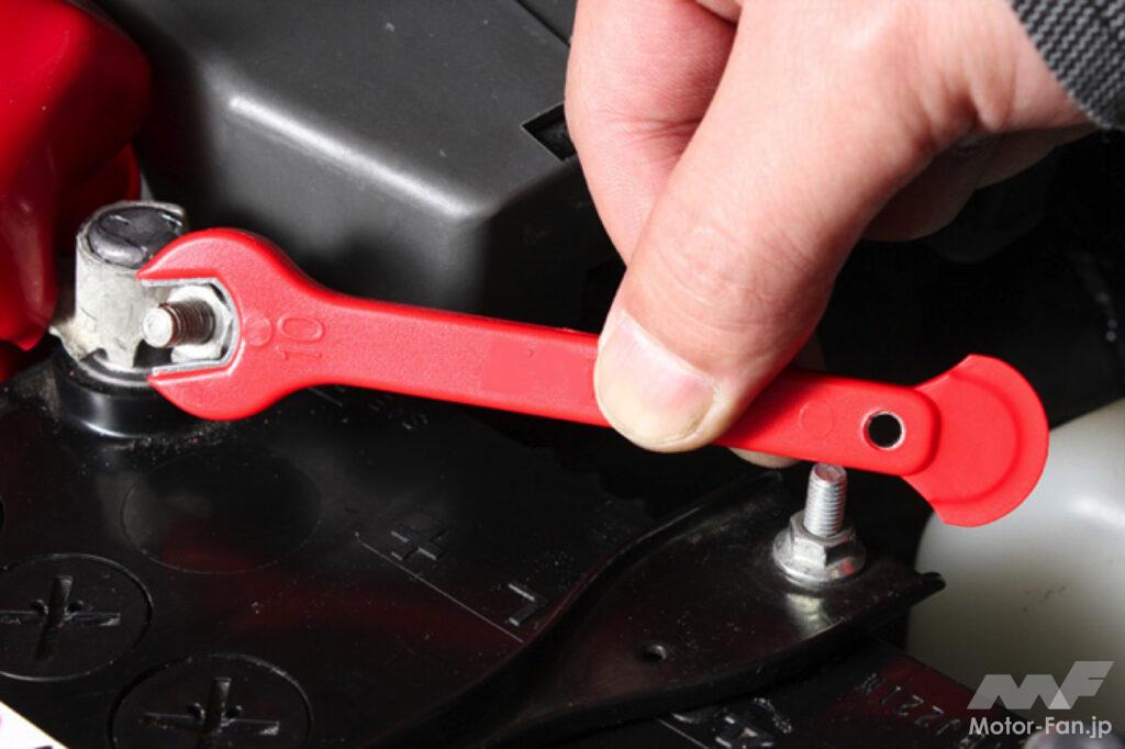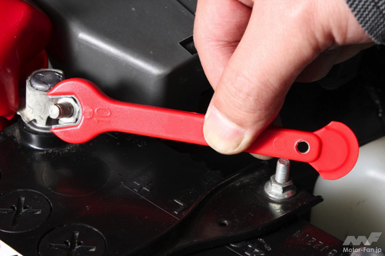 車種によっても端子の固定方法は異なるが、ロードスターのように作業のためのクリアランスが確保されていなかったり、ロングボルトのステーにナットで固定されていたりと、メガネレンチが使えないケースがほとんどだ。締結トルクも小さく舐める心配がないので、一般的にはスパナやコンビネーションレンチの片口側を使用する。なお、ロードスターは固定ボルトを抜かずとも緩めるだけで端子が外れる。