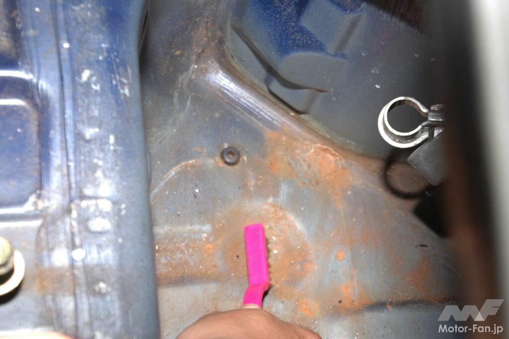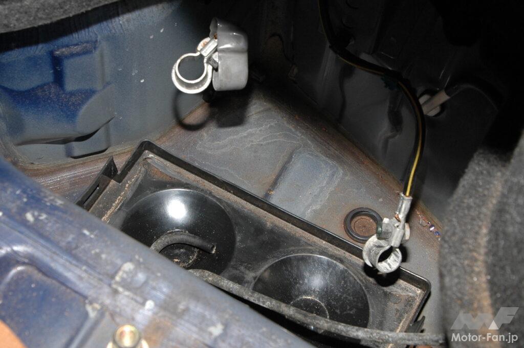 バッテリーを外したらバッテリーの下に置かれていたトレイやパネル部分をチェックする。この部分は漏れ出したバッテリー液や侵入した雨水によって錆などで腐食していることが多々ある。作業車のロードスターもトレイ下にあるパネルの表面が若干錆が浮いていたのでワイヤーブラシで掃除してワックスをかけておいた。
