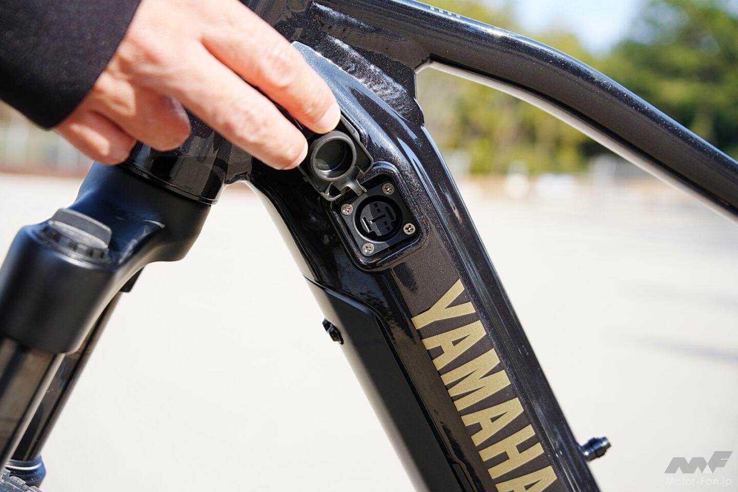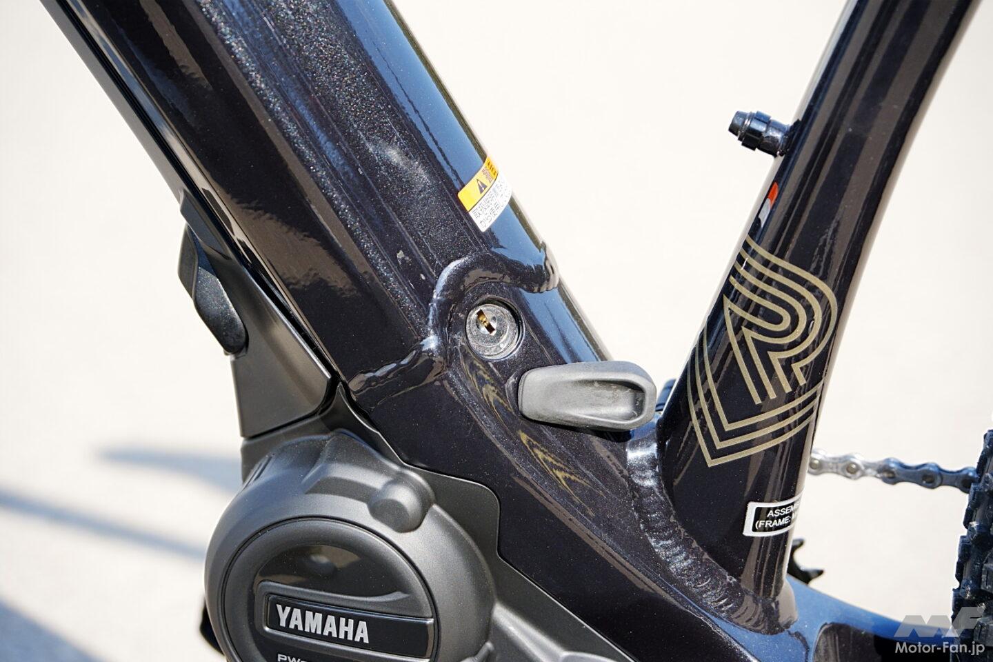 「YAMAHA」の大きなロゴが自信を見せているようなデザインのフレーム設計にも、バイクメーカーであるヤマハらしい工夫がある。一見するとオーソドックスなダイヤモンドフレームだが、ダウンチューブ内部は左右に分かれたツインチューブ構造となっており、バッテリーを挟み込む形で高い剛性z軽量化を両立している。モーターサイクルのフレーム設計思想を応用したもので、電動アシスト自転車としてはユニークなアプローチだ。