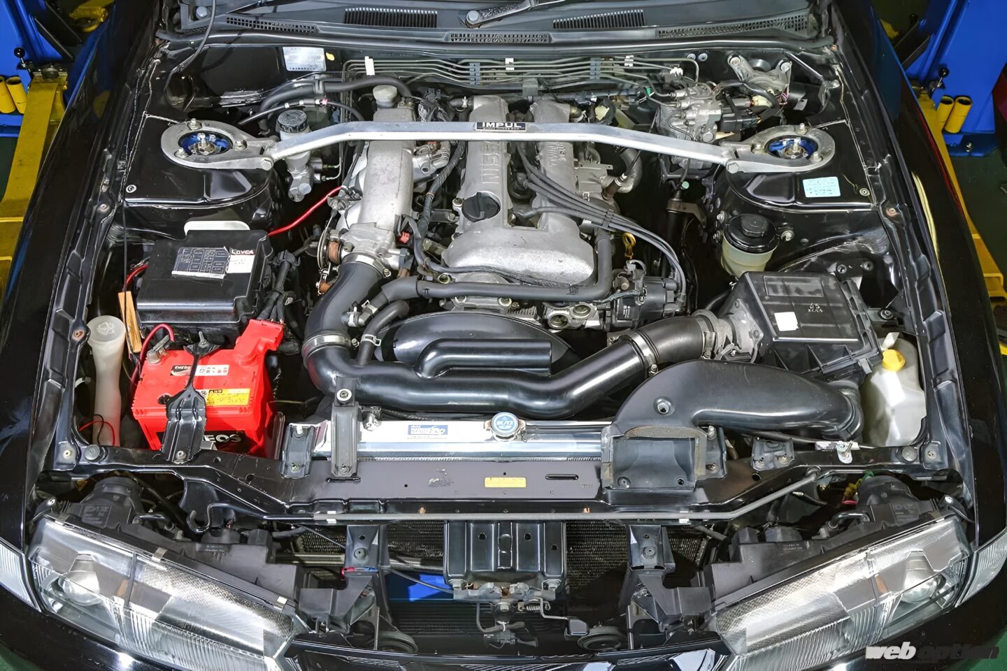 東名ポンカム(IN/EX256度)が組まれ、アドミクスオリジナル純正ECU書き替えで制御されるSR20DE。中高回転域でのレスポンスとフィーリングが激変しただけでなく、7000rpmオーバーまでパワーも追従するようになったことにオーナーの石渡さんも満足している。ちなみに、ブリッツレーシングラジエタータイプZSはかつてOPTION本誌のモニターレポートで当選し、装着したものだとか。
