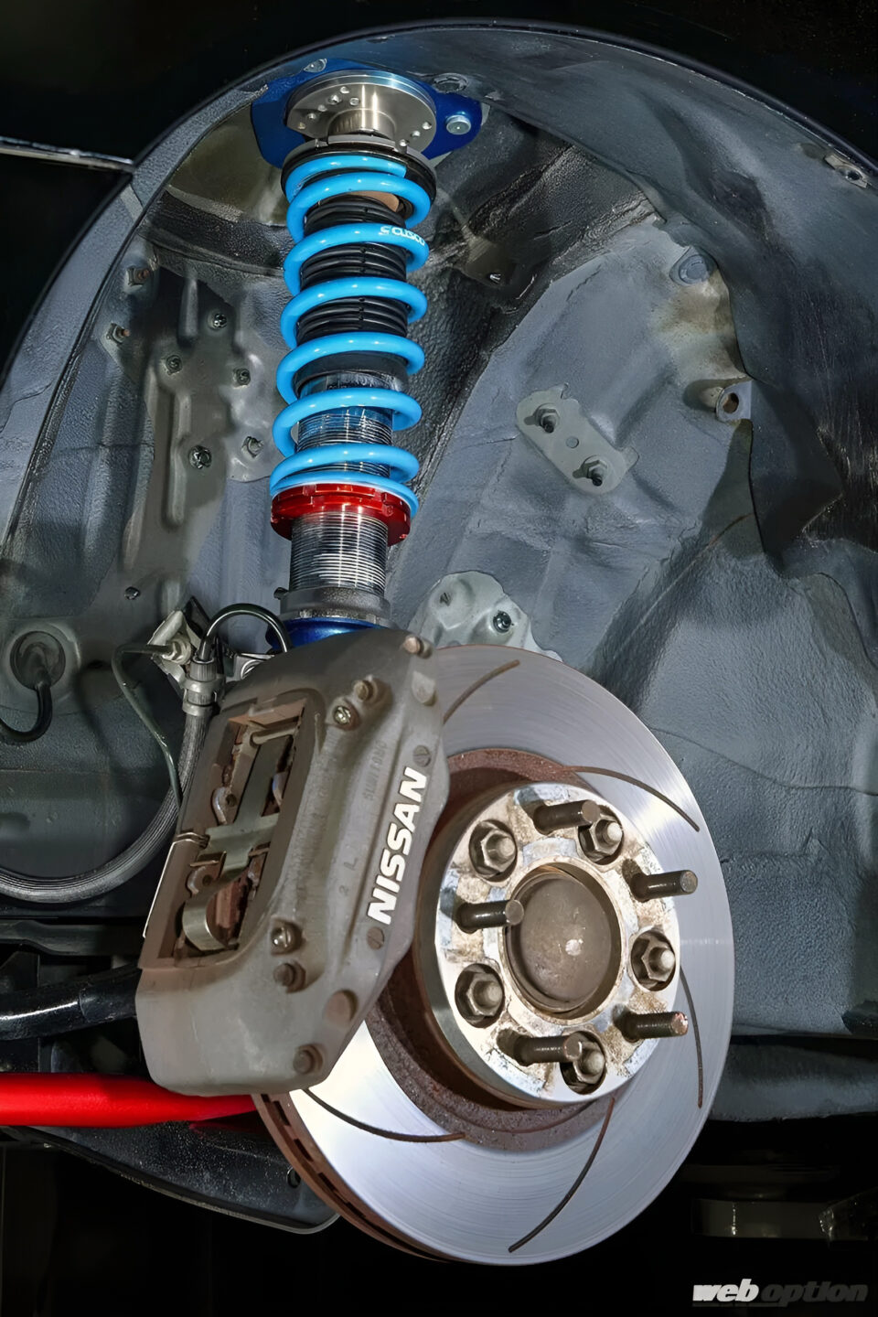 足回りにはクスコストリートゼロA車高調をセット。スプリングレートはフロント5kg/mm、リヤ4kg/mmとなり、乗り心地改善のため、一度オーバーホールを兼ねた仕様変更も行なわれている。また、フロントブレーキにはECR33純正キャリパーを流用。制動性能を高めている。