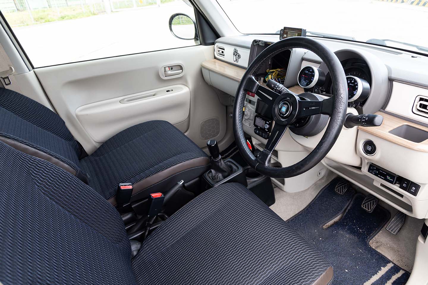 インテリアはまだ製作途中の部分もあり、配線加工に試行錯誤した痕跡が残る。5速MT化に合わせてコンソールやクラッチペダルもアルトワークス用を流用し、違和感のないポジションとなるよう丁寧にフィッティングを行った。