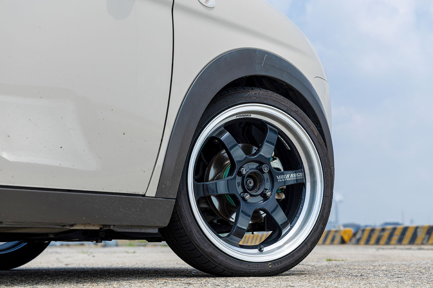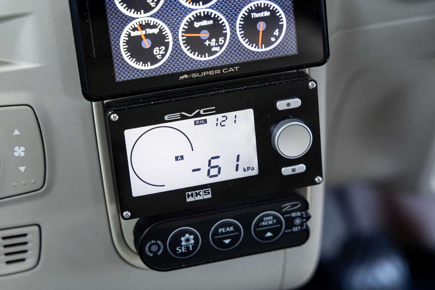 エンジンは単なる丸ごとスワップではない。ブロックとクランクシャフトはラパン純正を活かしつつ、ヘッドガスケットやピストン、タービンはアルトワークス用を流用。コンロッドにはキャリロ製を組み合わせた。NAとターボではブロック仕様が異なるが、そのまま使うのではなくオイルジェットやオイルラインを追加加工。こうした手間を惜しまず投入した結果、最高出力95psを実現している。ブースト制御はHKSのEVCを用い、最大ブースト圧は1.2キロに設定した。