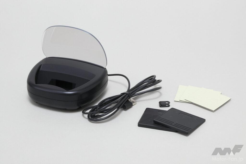 『LumieHUD』は視線を前方から外すことなくクルマの速度を確認できる、後付けタイプのヘッドアップディスプレイ(HUD)。最大の特長はUSB電源ケーブル1本を接続するだけで作動すること。取り付けも付属の両面テープでダッシュボード上に貼り付けるだけで、天頂衛星みちびきやGPSから得られた位置情報により、正確でリアルタイムな速度情報をフロントウインドウ前面に映し出すことができるのだ。