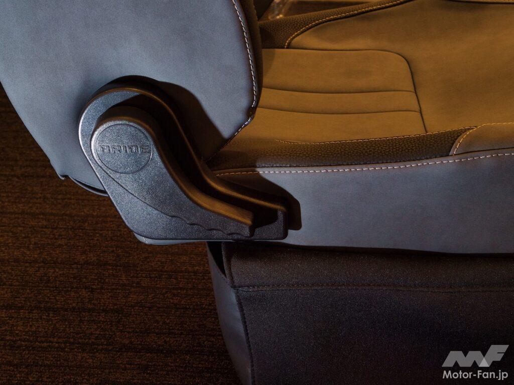 実用性も重視し、シートバックの角度調整はレバー式。レバーは力の入りやすい角度と長さ、そして邪魔にならない位置に設置。