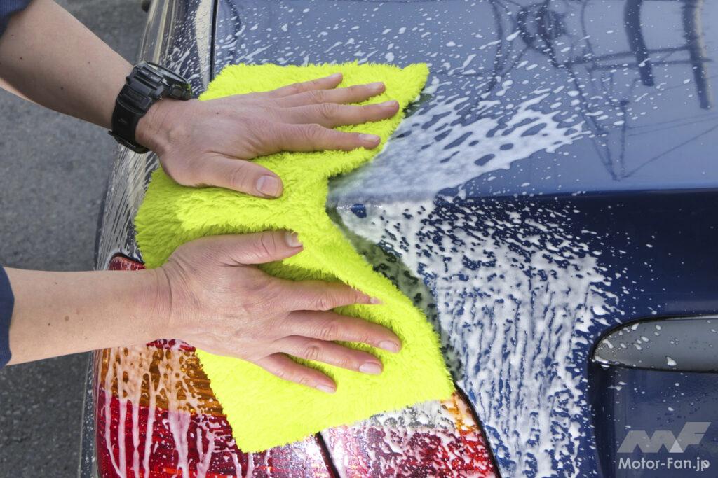 そしてすすぎを済ませたらカーメイトの『超吸水ゼロタオル』の出番だ。ボディに水滴が残っていると、シミになってしまう可能性があるので、手早く拭き取りたいが、このタオルはツイストマイクロファイバーを採用して、バツグンの吸水力を誇り、しかも圧倒的なサイズなので、途中で絞ることなく、洗車後の水分拭き取りを一気に済ませることができる