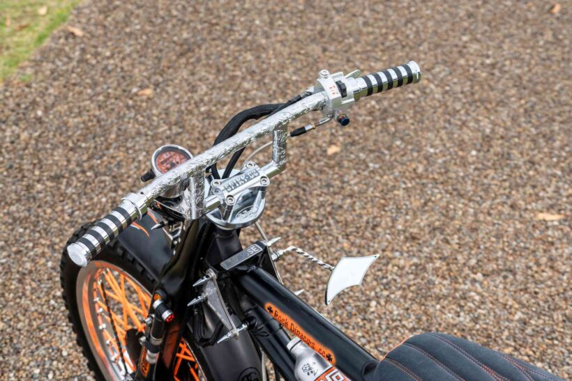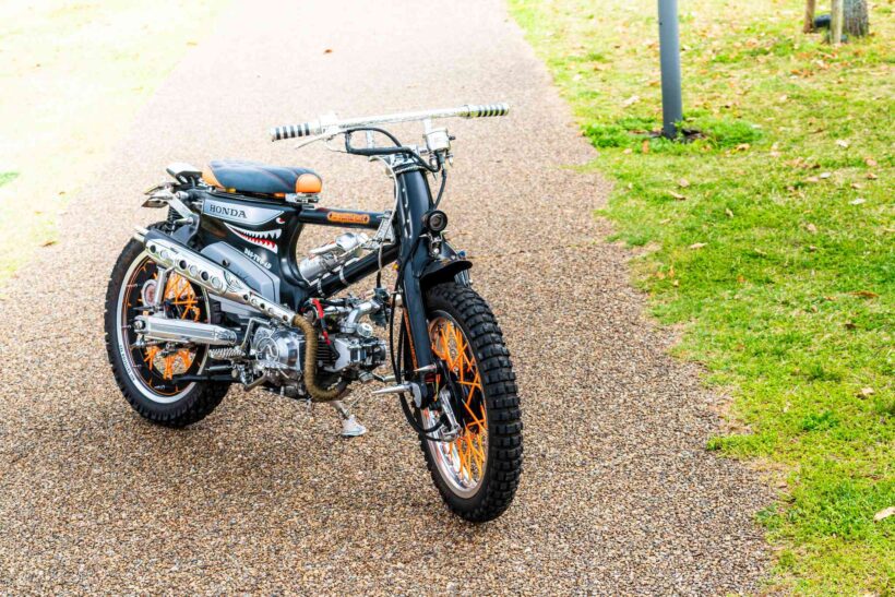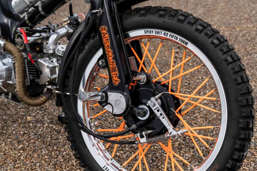 バイクカスタム スーパーカブだからここまでやれる!太足やフレームワークで美バランスを追求したトラッカースタイル【スーパーカブカスタム】【写真・7枚目】 フロントフォークにYSSのインナーキットを装着して走破性を追求。ちょい太足のワイドリムをセットする。 プロに施工を依頼したエングレービング仕上げのハンドル。コストはかなりかかったが、大のお気に入り! アルミのワンオフヘッドカバーや各部の鏡面仕上げで輝きを放つエンジン。中身は一般的な88cc仕様という。 全身に自作のエッチングパーツを盛り込み、近寄って見たくなる美しさを体現。ナンバー裏まで装飾される。 ほとんどステンレス化粧ボルトに変更し、ステー類も自作のスパイラル形状に。シートはファットムーン製だ。 スイングアームはKEPスピードの50mmロング。自作エッチングプレートを貼り、質感アップを実現する。 この画像の記事を読む