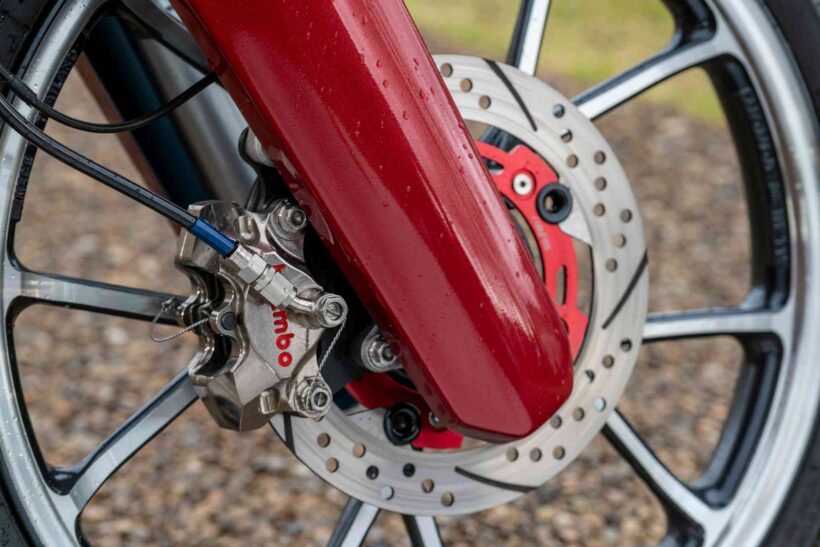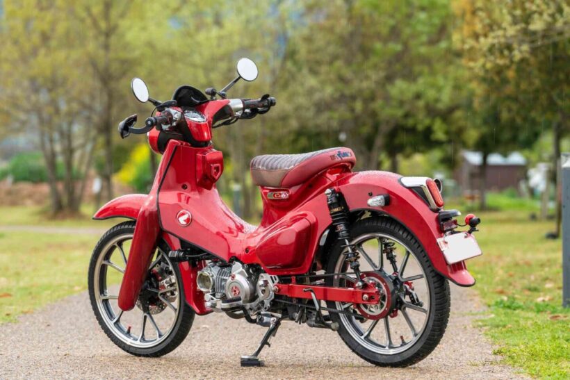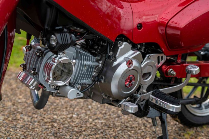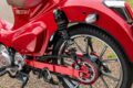 バイクカスタム スーパーカブC125は、レッグシールドを外すとここまで変わる!【スーパーカブカスタム】【写真・5枚目】 ブレンボ製ブレーキキャリパーとグロムのマスターシリンダーを装着。ブレーキディスクはサンスター製だ。 エンジンは基本ノーマルで、ヘッドのサイドカバーをモンキー125用の社外スケルトン仕様でドレスアップ。 SEでワンオフしたスイングアームをコーケンにてアルマイト処理。ベルトドライブキットはベトナムにて入手! レッグシールドをカットし、全身赤系の同色コーデでナローな一体感を演出。シート後部にはタイ語でオーナー名が入る。 この画像の記事を読む