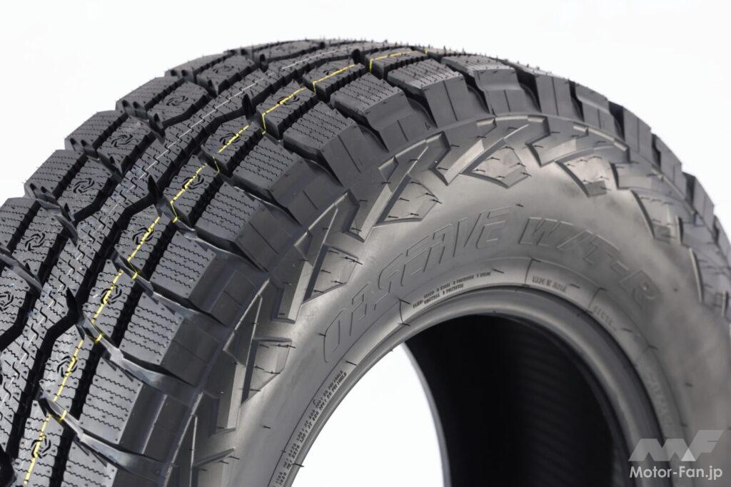 もうひとつのW/T-Rは、クロカン車に求められる荒れた雪道や深雪路での走破性を追求したスタッドレスだ。サイドウォールにまで回り込ませた大型サイドブロックは、深雪でのトラクション性能で効果を発揮しつつ、デザイン的なアイコンにもなっている。