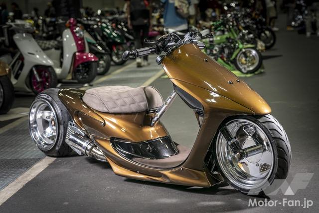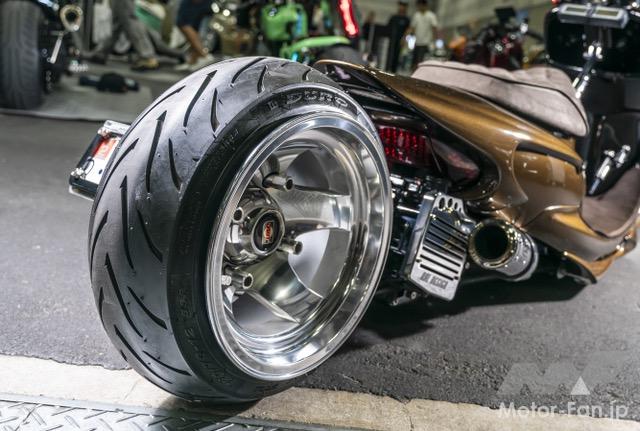 12インチの足周りはリヤにダグラス製(7J)、フロントにKN企画×WORKコラボ(3.5J)を装着。またテールランプやウインカーはナンバーステーにも追加している。