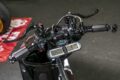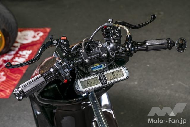 ハリケーン製ハンドルに自転車用の小型バーエンドミラーを装着。メーターはアクティブ製デジタルモニターとSP武川製燃料計を手前に配置する。マスターシリンダーは台湾のドラッグレースで活躍するWF製をチョイス!