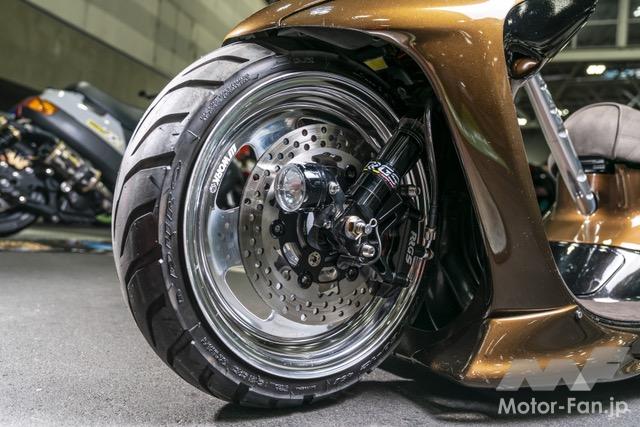 12インチの足周りはリヤにダグラス製(7J)、フロントにKN企画×WORKコラボ(3.5J)を装着。またテールランプやウインカーはナンバーステーにも追加している。
