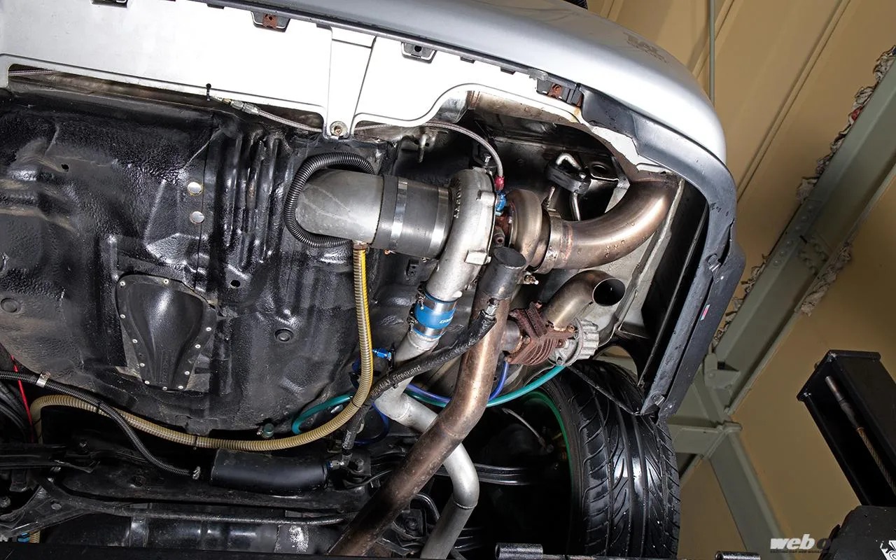 リヤマウント式ターボのメカニズムは非常にシンプル。タービン本体をリヤバンパー内部に設置し、エンジンからエキゾーストハウジングに繋がるEXマニと、コンプレッサーハウジングからインタークーラーに繋がるパイピングをそれぞれ6メートル近く延長している。