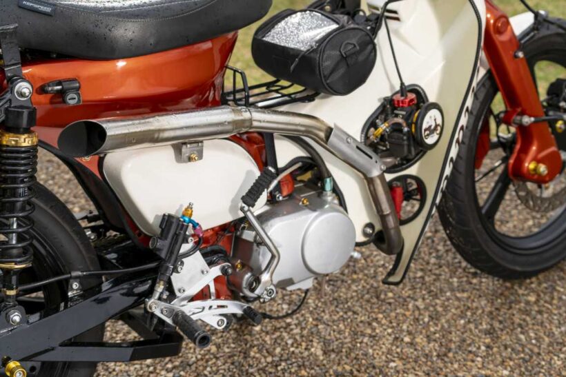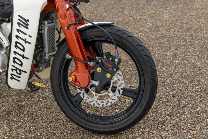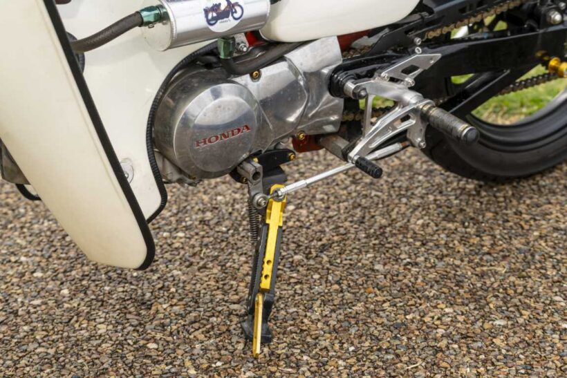バイクカスタム カブにTZR50Rの足周りを移植なんてアリ!?自作でもここまでやれるから楽しいんです!【スーパーカブカスタム】【写真・6枚目】 フロントフォークをワイド加工し、TZR50Rのホイールを装着。フェンダーの素材は塩ビパイプで、ステーから自作している。 適度な垂れ角のロボットハンドルで、スポーティなポジションを構築。メーターは電気式の社外品をワイヤー式に変換して使用している。 バックステップはモンキー用を流用。取り付け部を加工し、コントローラブルなポジションに仕上げた。サイドスタンドは調整式。 PCXのピストンを組み込んだ社外125ccエンジンを搭載。タイカブの4速セミクロスミッション、田中商会のアップマフラーを装着する。 TZR50Rの前後ホイールとスイングアームにより、スポーティなルックスへ変身。前後ブレーキもディスク化でき、一石二鳥だ。 スイングアームごとTZR50Rのリヤまわりを移植し、リヤサスはRFYのツインショック仕様に。ブレーキも同時にディスク化している。 この画像の記事を読む