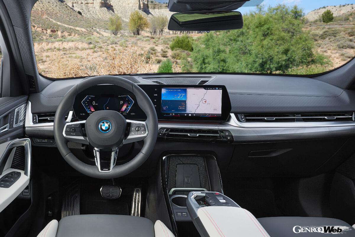 X2はインテリアデザインもX1とおおむね共通だが、2枚のディスプレイを横並びに配置し一体化させたメーターおよびインフォメーションディスプレイは、湾曲して運転者へと向けられる。エアコン操作パネルも運転者の方向を向いており、ドライバーを中心としたクルマであることが伺えるデザインだ。