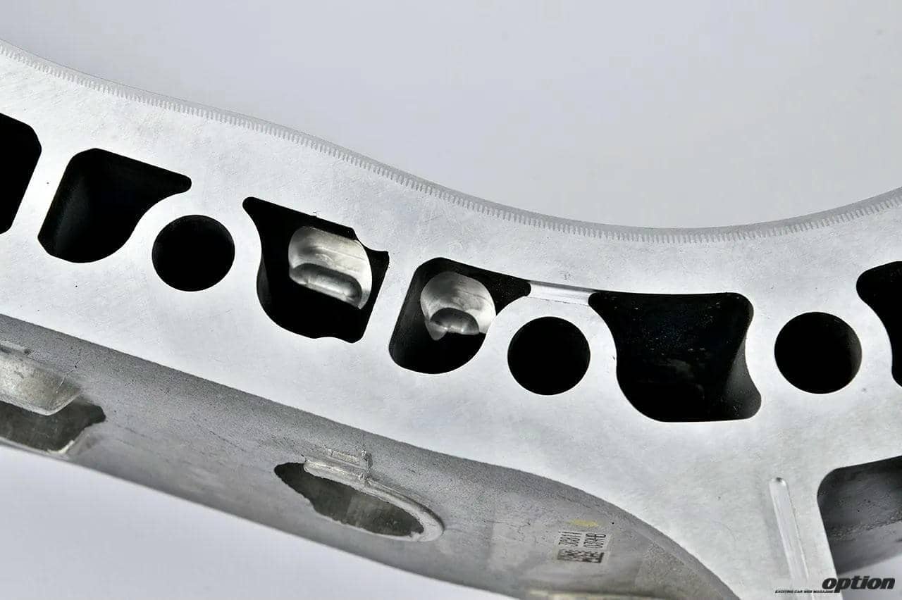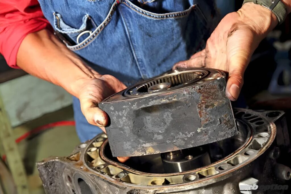 また、ローター側面を切削して軽量化した試作ローターも現在テスト中。実用化に向けて開発が進められている。燃焼室(バスタブ)の容積合わせも、機械加工によって正確に行われる。