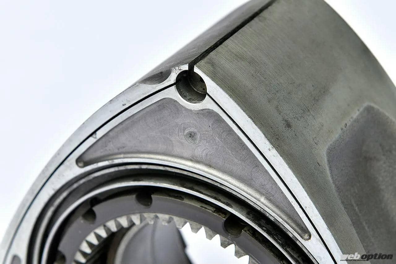 FD3S純正ローターをベースに、RX-8向けにカスタムされた加工では、カットオフシールを追加することで、RX-8用のサイドシールを装着できるようになっている。