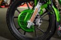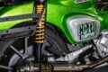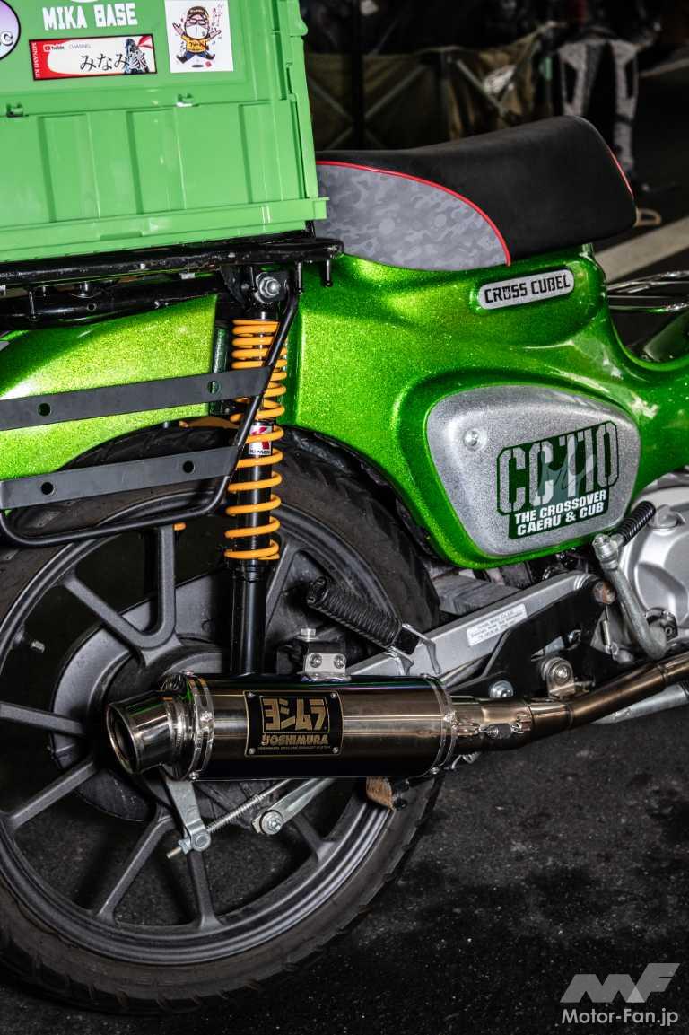 バイクカスタム ド派手なグリーンラメでイメージ激変!クロスカブを美しく豪華に演出!【スーパーカブカスタム】【写真・4枚目】 ヘッドライトとシートはあえて純正のまま残し、“くまモン仕様”であることをアピール。粗めのフレークを使ったペイントは、遠目でも煌びやかさが伝わる。 前キャリア両側をカットし、先端に小型サブウインカーを内蔵。被視認性を高めている。配線はパイプ内を通し、見た目もすっきりとまとめた。 オイルダンパー式のキタコ製リアショックは、プリロード無段階調整が可能。荷物が多い時はサイドバッグを装着できるようステーも備える。 本来は黒い後付けディスクガードやエアクリカバーも同色でペイントし、塗装面積を拡大。統一感を高めている。 この画像の記事を読む