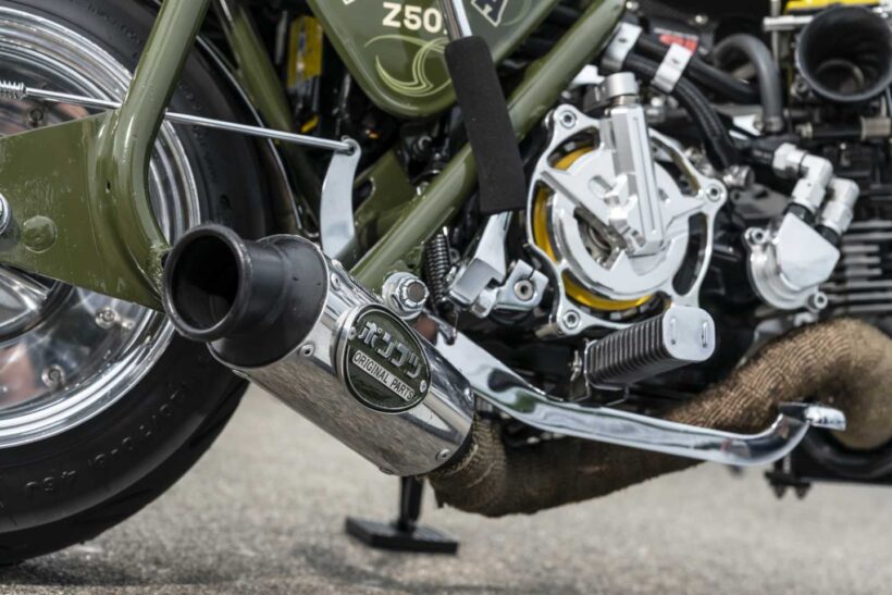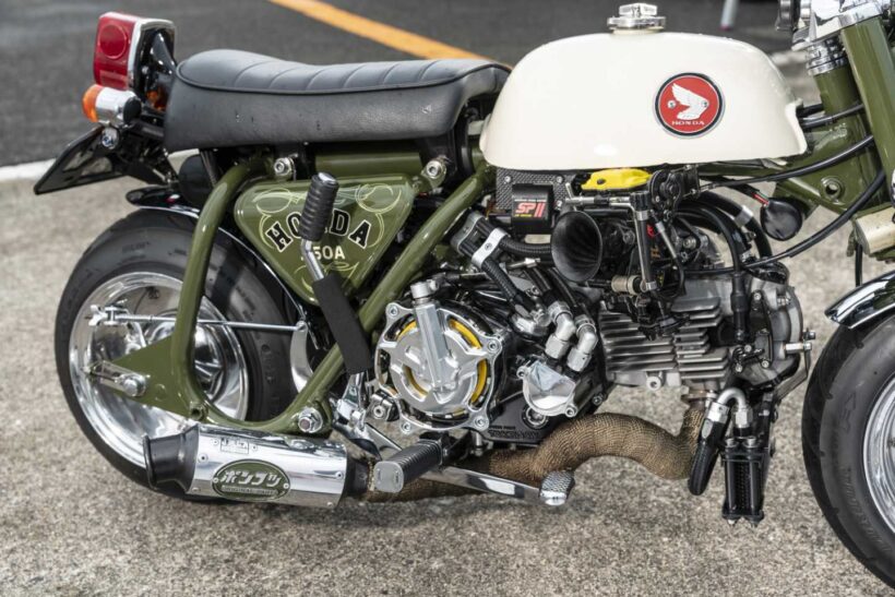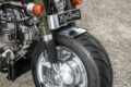 バイクカスタム 「ウイリーしちゃいそう……」こんなに小さい1969年生まれのZ50A型モンキーが、138ccボアアップで怪物パワーを獲得【写真・5枚目】 エンジンはAB27ベースでSP武川スーパーヘッド4V+Rを組んだ138cc仕様。ヘッドが干渉しないよう、フレームを延長加工している。 マフラーはポンコツモータースにてワンオフし、ベストなスタイルを追求。クラッチカバーは地元岡山県の県章柄に削り出す。 8インチのフロントホイールは純正フロントフォークにギリギリ収まる4.2Jサイズ。ほぼリジット仕様でローダウンされている。 ボリュームアップしたエンジンを中心に、8インチ仕様で凝縮感のあるフォルムを実現! このバランスこそ、最も苦労したポイントだ。 この画像の記事を読む