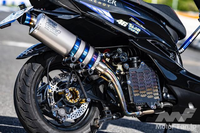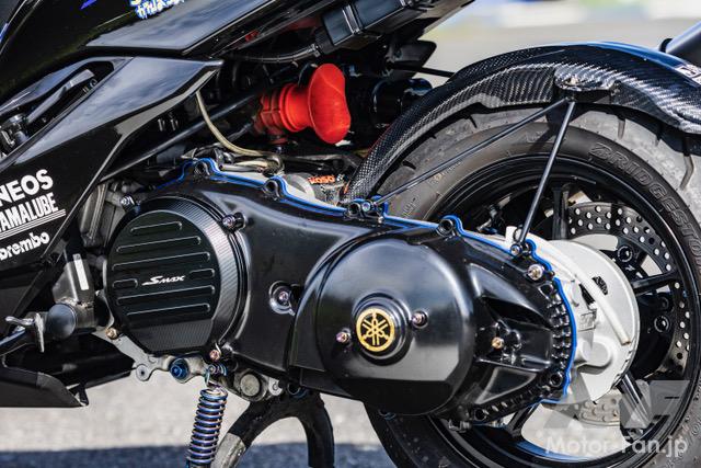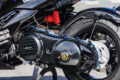 駆動系カバーはパウダーコートが施され、リヤのインナーフェンダーはカーボンが奢られ、その前方には吸入系統のファンネルが配置される。