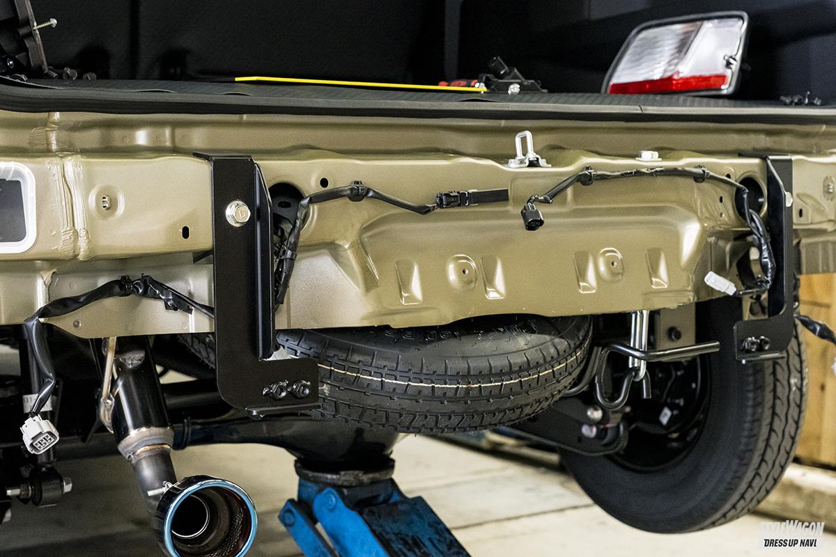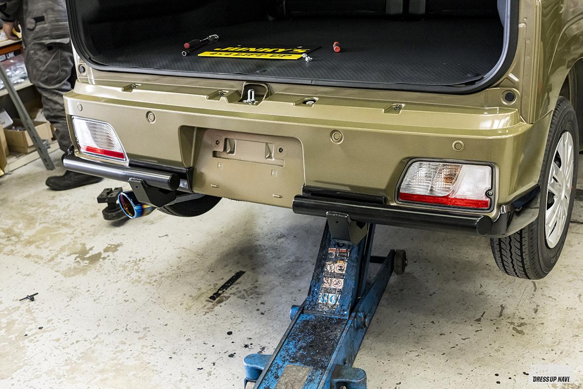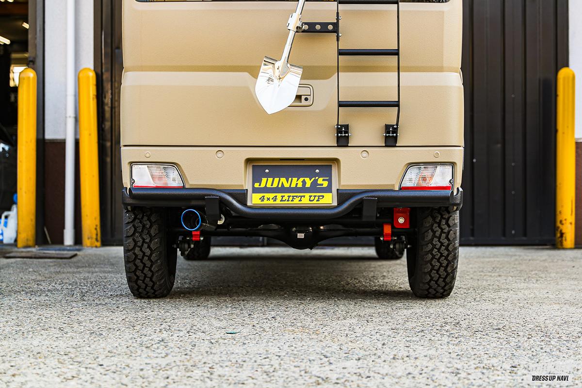 個人的な調べで申し訳ないが、アトレー用のスチールパイプバンパーはフロント用こそ複数あれど、リア用はジャンキーズ4×4製以外に見たことがない。仮に存在していたとしても、レアなアイテムであることは間違いない。ジムニーならフレームに固定すればいいが、モノコックのアトレーはどのようにマウントしているのか気になった。