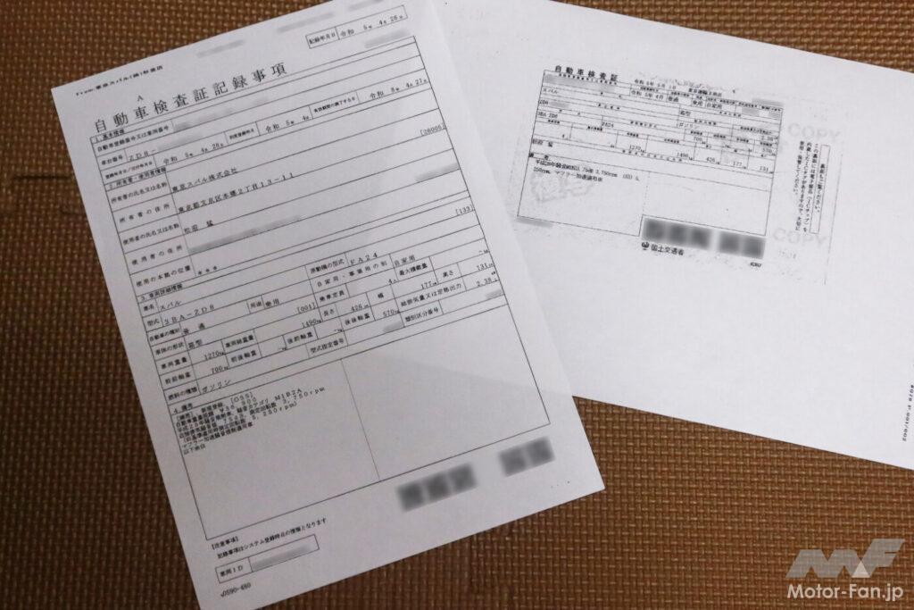 ほどなくしてFAXが2枚届いた。1枚目は車検証だが、見慣れたものよりもずいぶんと小さくて「縮小コピーか?」と一瞬思った程。じつは2023年1月4日から車検証が電子化され、ICチップを埋め込むとともに記載内容を簡素化し、サイズも小さくなったというわけだ。もう1枚は自動車検査証記録事項という紙だった。