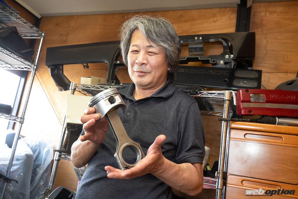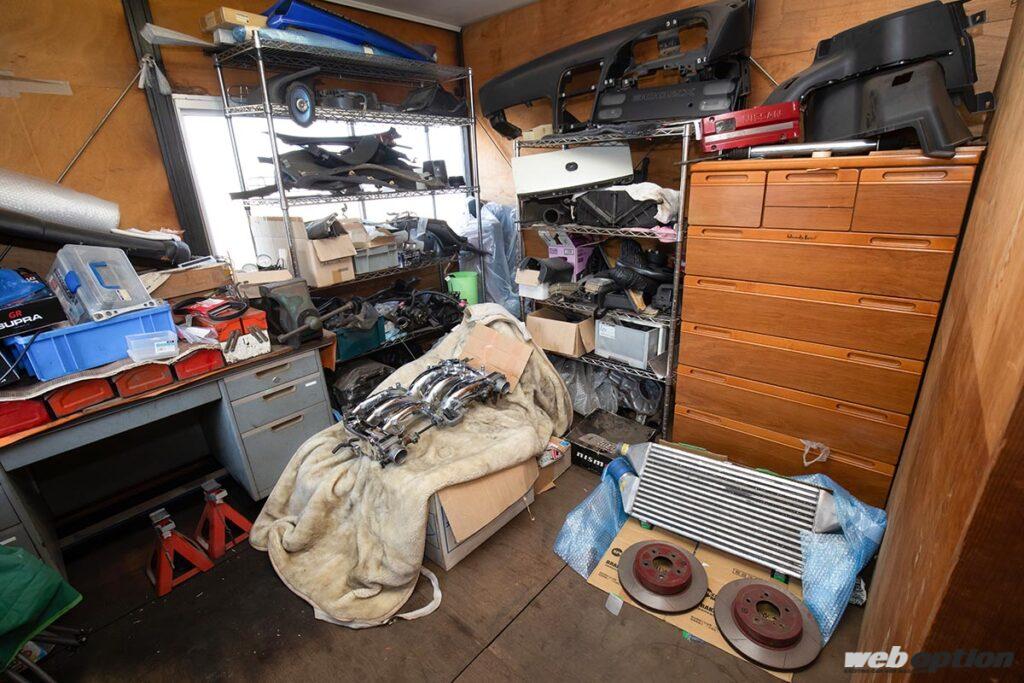 エンジン製作まで自分でこなす敏腕プライベーターのSAWAさん。秘密の倉庫には純正パーツなどを豊富にストック。今となっては貴重なアイテムも数多く揃えられていた。