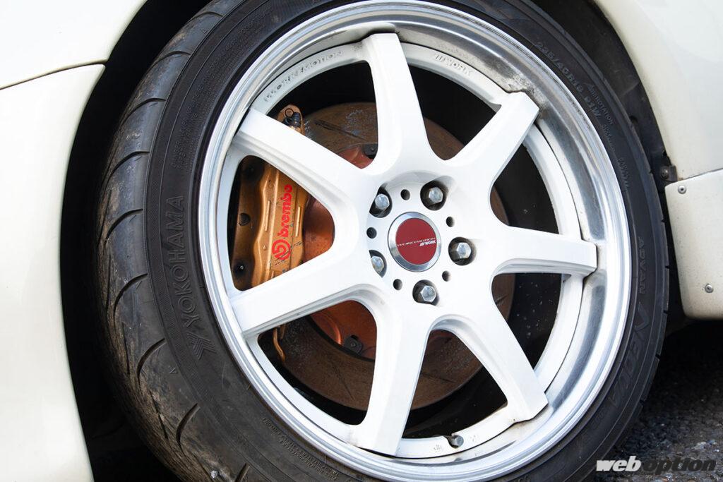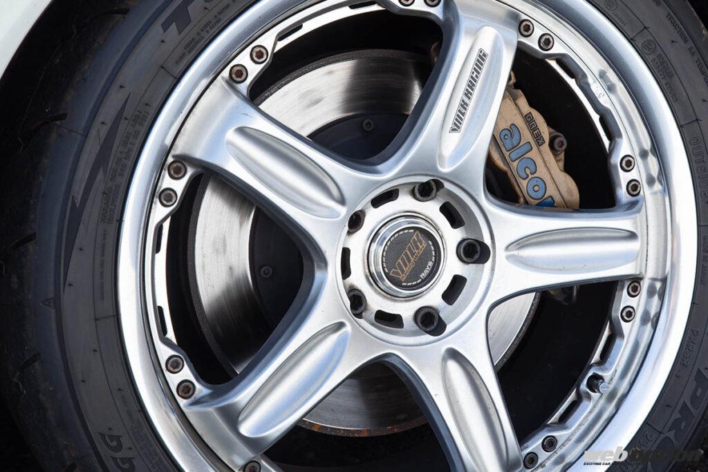 ブレーキは友人から譲り受けたというアルコン4ポットに、324φローターを組み合わせる。18インチホイールは当時物のボルクレーシングGr.Cを履く。